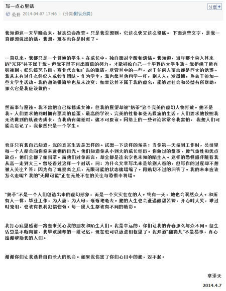 一直以来,我都只是一个普通的学生。在成长中,独自面对辛酸和烦恼。我知道,当年那个突入其来的“光环”并不属于我。但我不得不付出百倍的努力,才能够给自己一个平静的大学生活。我拒绝了所有影视剧、娱乐综艺节目、商业代言和广告的邀请,尽管其中的一些,对于任何人而言都是巨大的诱惑。我从未有过什么经纪人或炒作团队。作为学生,我也像其他同学一样,刷人人,发微博,热衷于参加一些大学生活动。我的想法很简单也从未改变:如果这并不属于我的虚名,能够对社会和公益有所帮助,那么它是我应该做的。