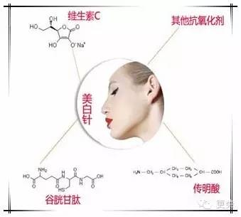 而美白针的三大主要成分是:谷胱甘肽、传明酸、维生素C