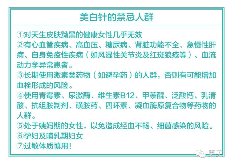 对于想打美白针的北鼻们,所长还是劝你,如果你确实想美白,首先要注意防晒,还要有规律的饮食起居,如果确实想用药物来变白,还是本着能口服不静脉注射的原则才好~