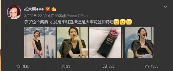 所长先带大家看看雪梨,话说她参加完tb直播盛典以后,自己也在微博上发了活动的皂片