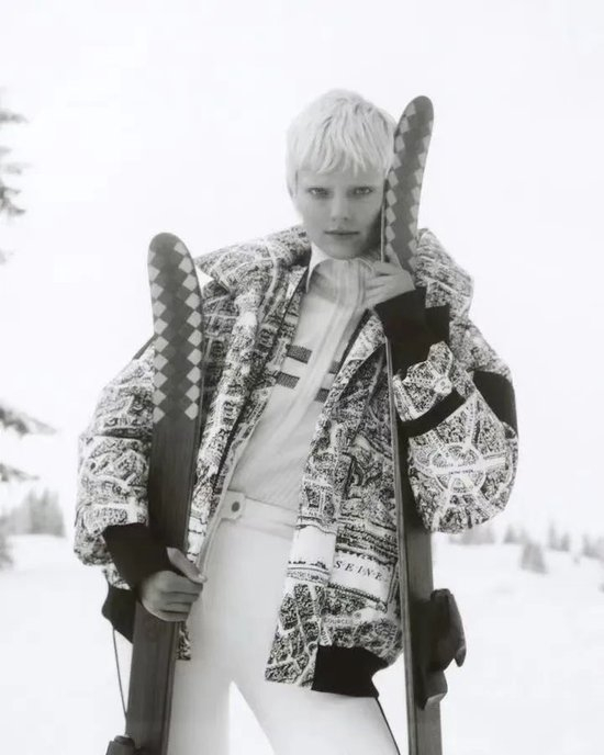 Chanel 2023/24 Coco Neige高级成衣系列。这位年轻的法裔美国女演员身着精致的高科技紧身衣。广告大片展示了运动与时尚之间浑然天成的联系,呈现香奈儿为雪场和舞池打造的年轻又充满女人味的高级成衣系列。