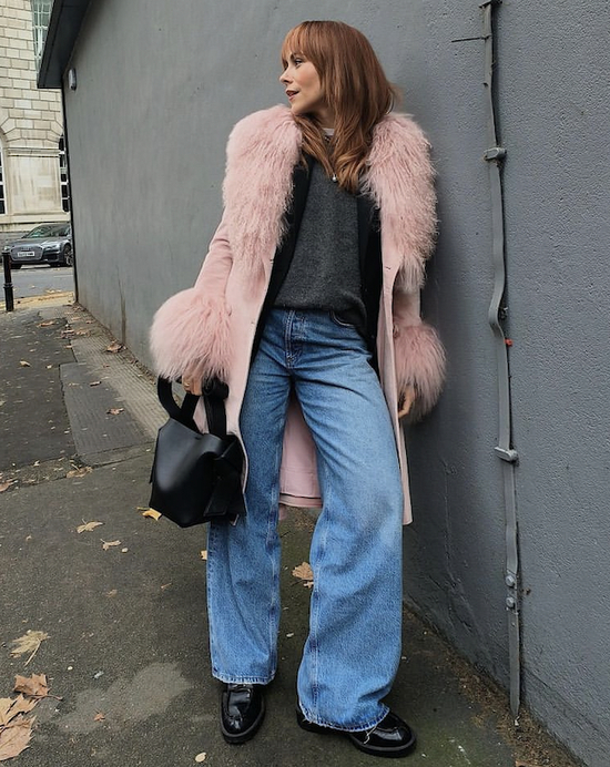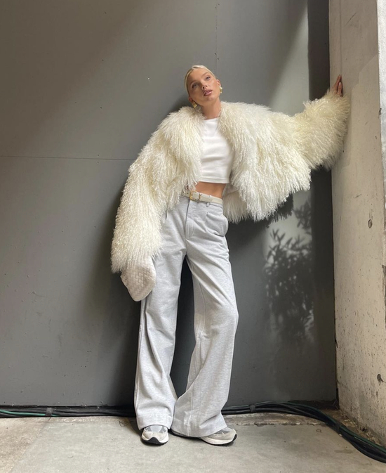 混搭运动休闲风格的牛仔裤、西装裤、运动裤等,这些单品的松弛感总能拉近毛毛大衣与日常的距离。