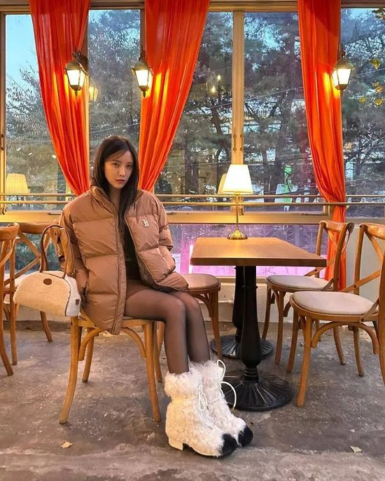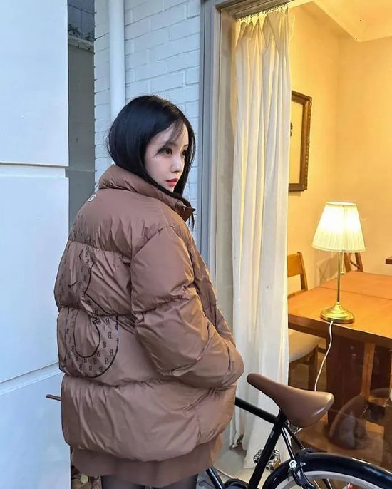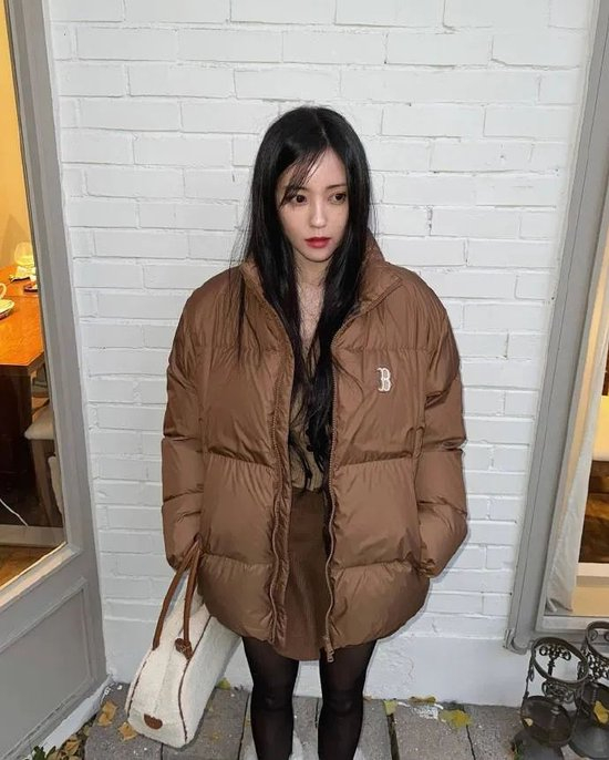 孝敏欧尼带来羽绒外套美拉德 Look,她身穿 MLB 老花鹅绒羽绒服内搭棕色系针织长袖和短裙,下半身黑丝搭配香奈儿毛毛靴,拎韩国小众品牌 Avam 摇粒绒托特包也融入美拉德元素,姐的搭配真的有很多小心思~