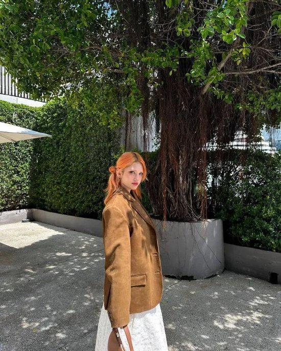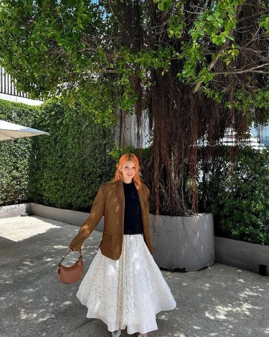 Somi 重复穿着 Prada Oversized 西装外套演绎美拉德穿搭,搭配白色长裙和下半身失踪松弛感与街头辣妹两种不同风格,一衣多穿也可以很有新意!